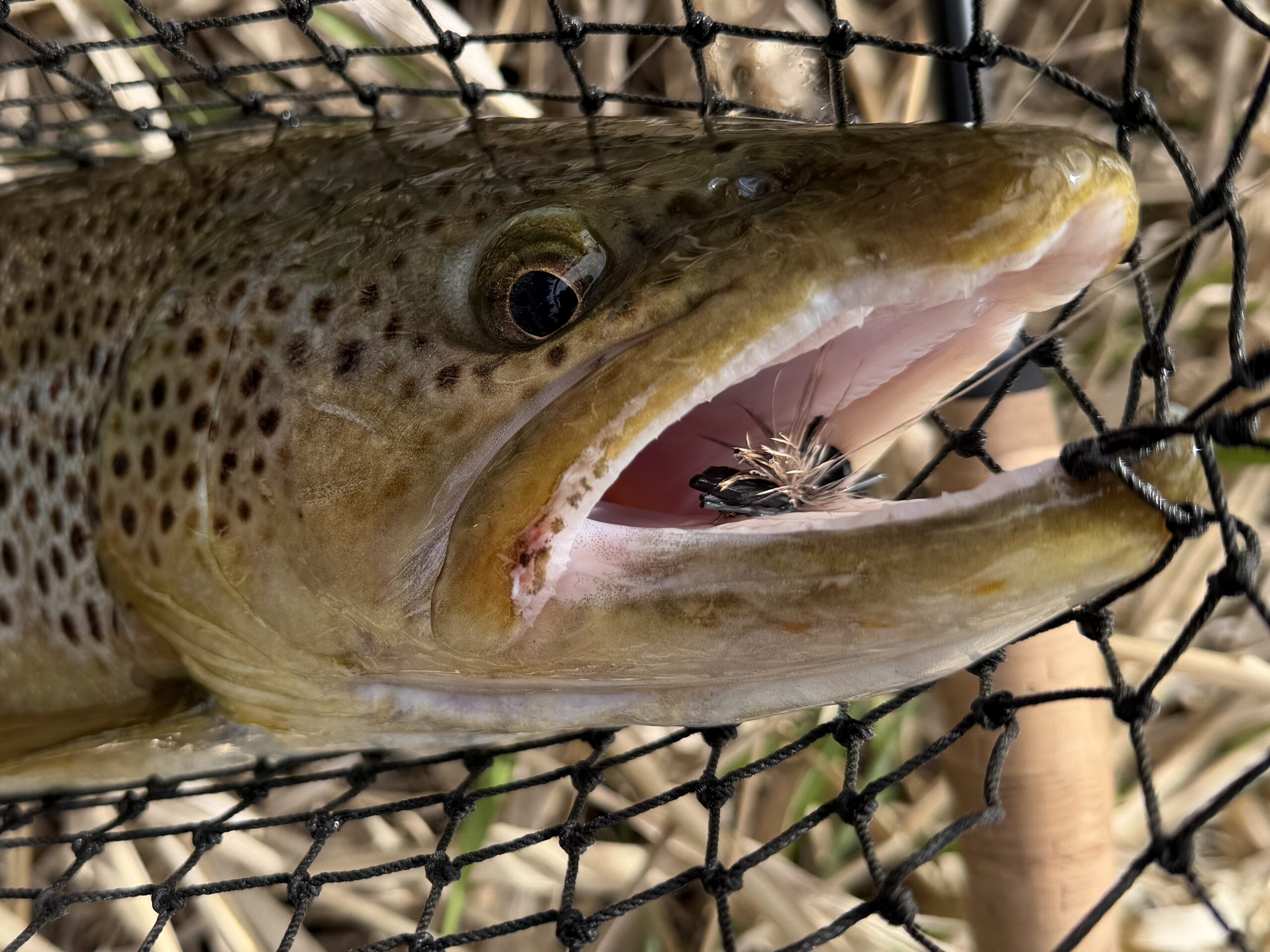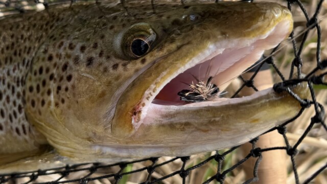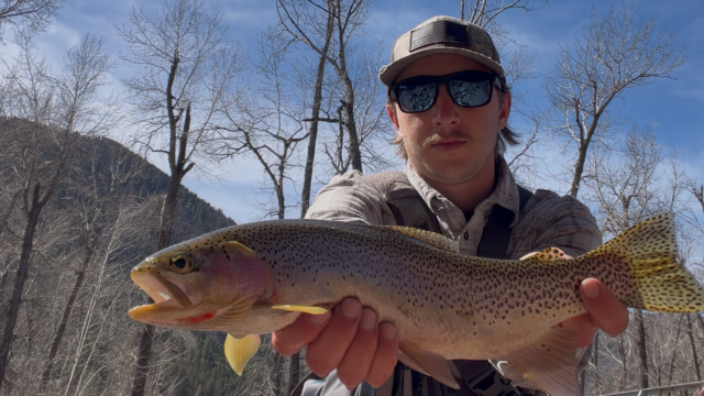 Up and down, up and down. That describes both the weather and the water and fishing conditions this past week. A warm trend brought the streamflow up over 1000 cfs, which is very rare for March. Just before that big rise, the fishing was absolutely stellar. San Juan worms were (and likely still are) the ticket, and the streamer game picked up nicely. There was even dry fly action; a classic Gypsy King pattern caught a 22-inch brown trout a few days ago (see picture below). When I went out, I saw a lot of bug activity over the water and even some stoneflies.